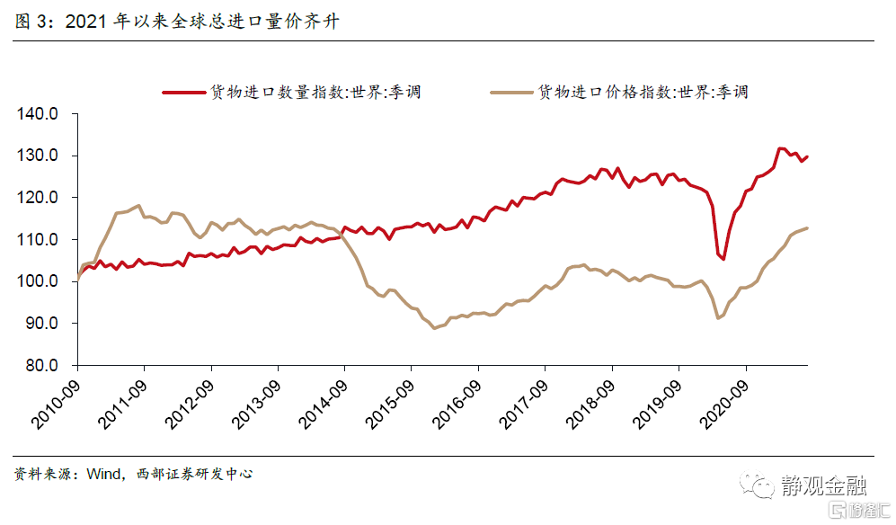 首先是出口份额,即出口金额占全球外贸总需求比重。比如,去年5月以来,由于中国供应链修复速度明显快于海外,中国出口份额持续上升。第二是外需环境。去年二季度,海外疫情爆发令外需一度大幅回落。但随着欧美经济边际修复,叠加财政刺激力度上升,海外进口总额逐步反弹。第三是价格因素。今年以来,海外进口总额增速明显走强,创下历史新高。