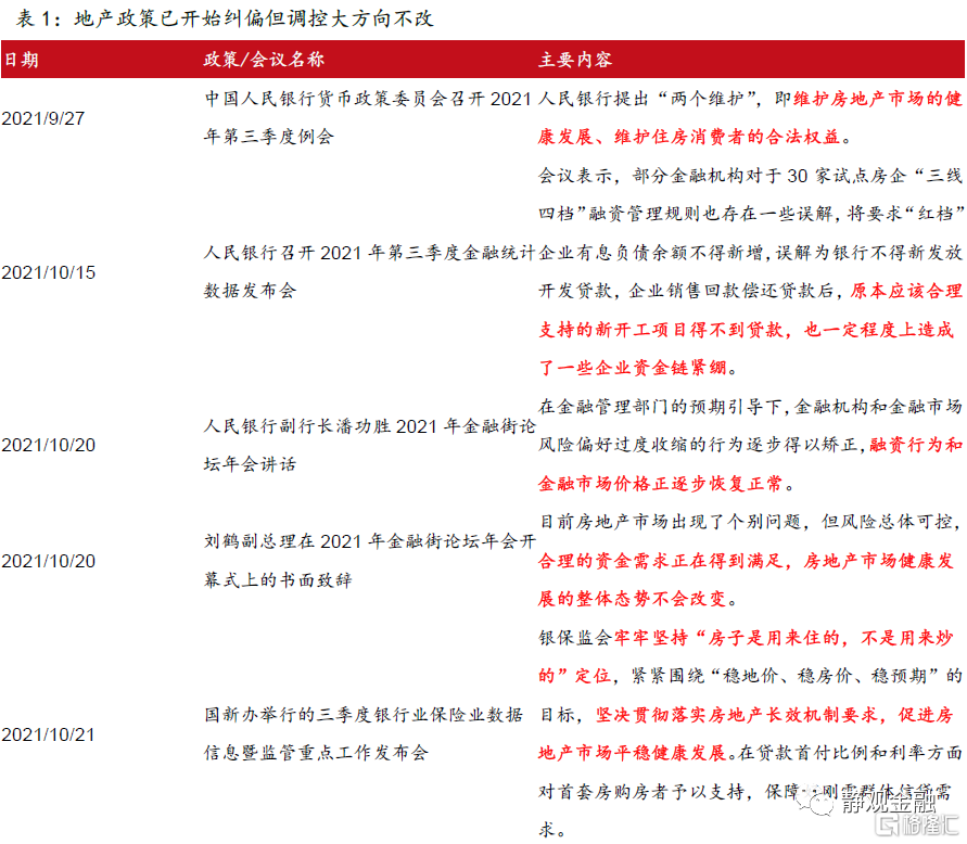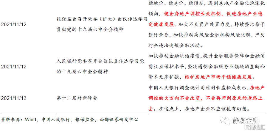 目前在“抑制价格过快上涨”缓解中下游成本压力以及金融防风险等方面的政策信号已经非常明确。此外,人民银行的《人民银行党委召开会议认真传达学习党的十九届六中全会精神》中提到“做好跨周期设计,统筹考虑今明两年政策衔接”说明我们此前提到的明年“宽货币”、“稳信用”政策组合有望前置。一旦地产相关贷款回暖,明年甚至可能呈现出“宽货币”叠加“(边际)宽信用”的组合特征。