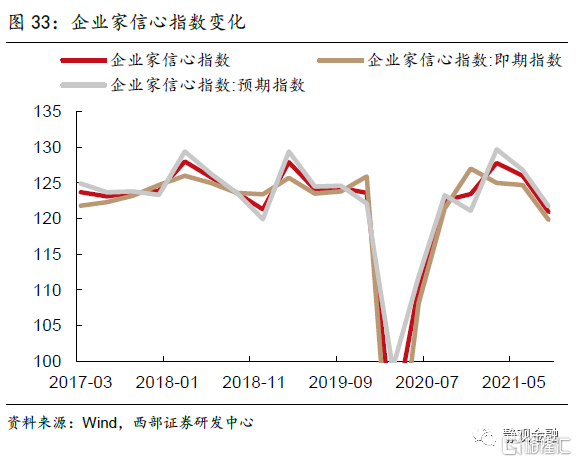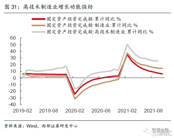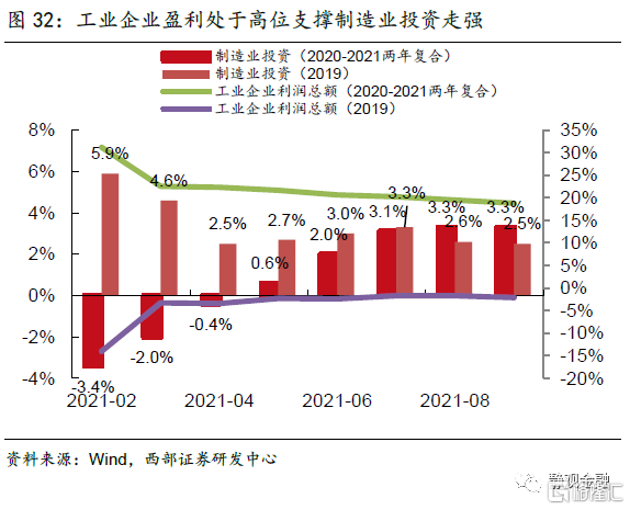 制造业盈利预期向好,投资增速有较强支撑。今年以来,制造业投资尤其是高技术制造业投资保持了强劲的增长动能,前三季度固定资产投资、制造业投资、高技术制造业投资增速分别为7.3%、14.8%和25.4%。从两年复合同比增速来看,1-10月制造业投资同比增长3.8%,优于疫情之前2019年同期的2.6%。今年以来制造业投资扩张动能强劲的重要原因之一是工业企业盈利处于高位,企业当前的中长期资本开支意愿仍然较强。从企业家信心指数和企业家宏观经济热度指数来看,虽然两项指标2021Q3均出现明显回落,但企业预期仍好于即期,我们认为这主要是由于能耗双控执行力度强化以及疫情反复对企业生产端带来的阶段性负面影响所致,而并非趋势性回落的拐点。预计明年工业企业盈利仍有保障,制造业投资向好趋势不变。