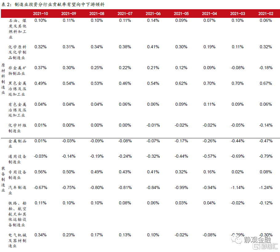 从制造业投资结构来看,和利润格局类似,今年受益于价格因子贡献,上游原材料行业对制造业投资拉动作用较大。在PPI触顶后,利润格局有望改观,中下游对制造业投资的贡献率或将提升。另外,随着疫情影响弱化,居民收入水平的改善有望推动明年消费品制造业投资贡献率温和修复综合判断,预计明年制造业投资增速将保持平稳,同比增长约5%左右。