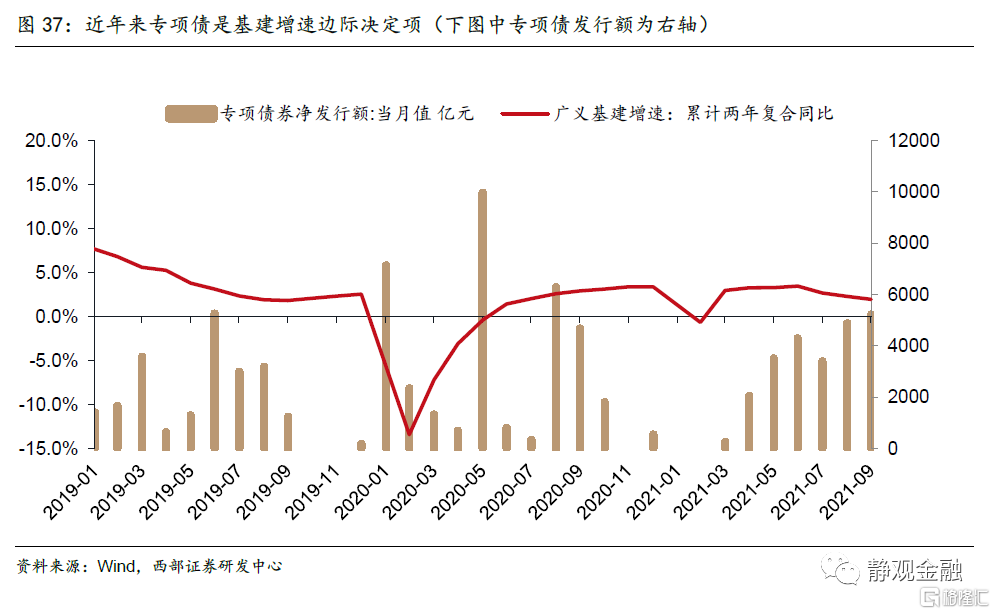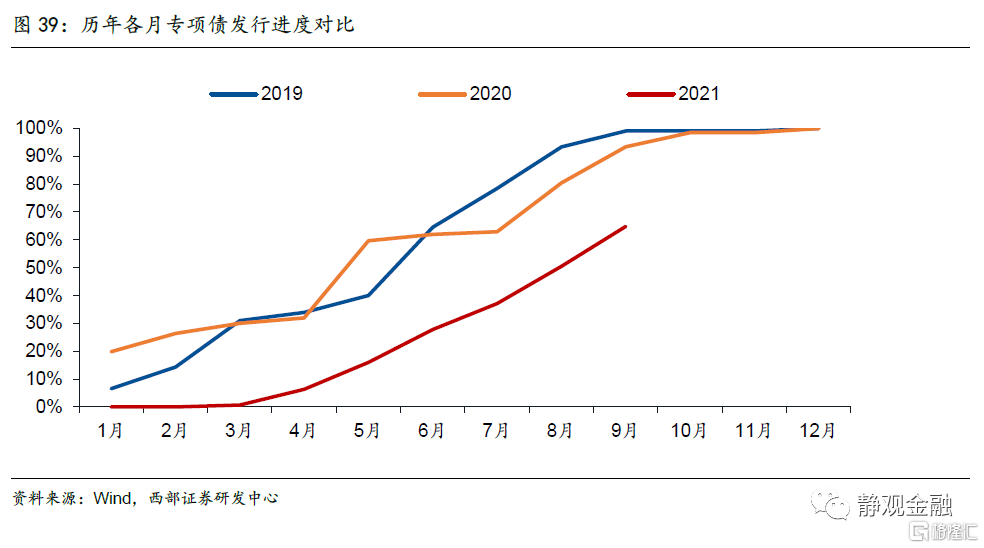 2021年专项债发行节奏后置是基建增速低迷主要原因。今年上半年由于稳增长压力较小,因此专项债发行进度较慢,对基建增速形成拖累。今年下半年以来,由于本土疫情反弹叠加突发性自然灾害,经济存在一定下行压力,政策要求加快地方政府债券发行进度,推动今年底明年初形成实物工作量。由于今年8月专项债已经加速发行,且根据财政部,今年专项债预计11月底前发完,因此10月和11月预计将累计发行1.4万亿左右的专项债,按照专项债发行领先基建投资3个月左右的历史趋势,预计今年年底到明年Q1形成实物工作量,推动基建增速上行。