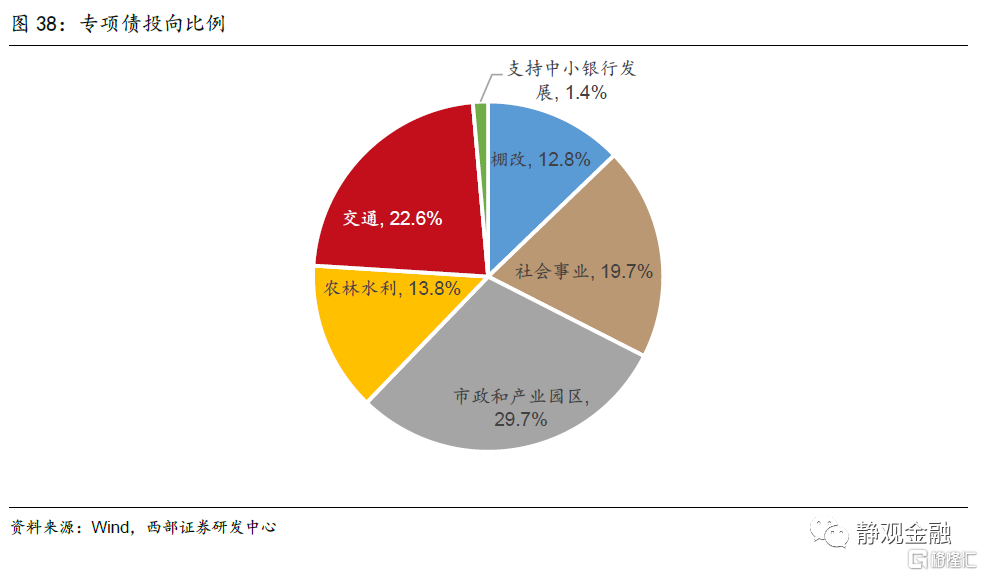 2020年以来地方政府专项债投向基建的比例有所上升。2019年专项债的投向仍以土储和棚改为主,占比合计65%;投向基建的比例大约30%左右。2019年9月,国常会提出专项债资金不得用于土地储备和房地产相关领域,专项债投向基建的比例明显上升,截至2021年8月末,基建投向占新增专项债比例约63%。另一方面,专项债作为项目资本金使用时通常可撬动2倍的杠杆资金,因此去年以来专项债对基建增速影响明显上升。