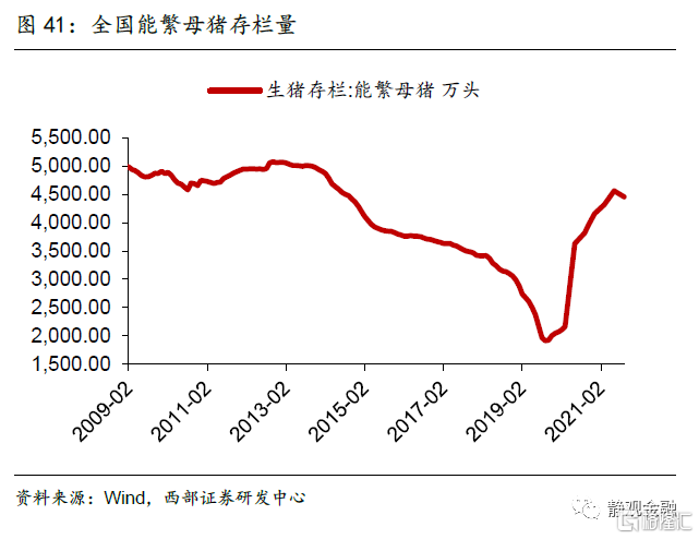2)能繁母猪已有高位回落迹象。今年Q2末全国能繁母猪存栏量为4564万头,显著高于农业农村部提出的“十四五”期间目标值,因此政策层面并无进一步提高全国能繁母猪存栏量的意图。而近期数据显示Q3末全国能繁母猪存栏量为4459万头,环比-2.3%,为2019年Q3以来首次转负,初步印证了我们的判断,未来猪肉供给收缩指日可待。