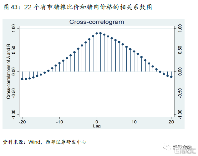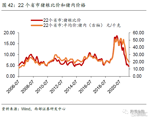 3)明年4月大概率对应本轮猪粮比周期底部。2006年至今猪粮比已走过近4轮周期,每轮长度4年左右,根据历年经验,我们大致推测2022年4-5月猪粮比有望触底。猪粮比与猪肉价格高度正相关,且猪粮比的1个月滞后项与猪肉价格相关系数最高(89.75%)。若猪粮比于明年4-5月触底,那么5月(不晚于6月)猪肉价格大概率实现触底反弹。