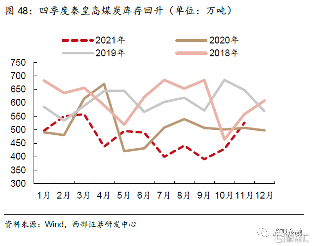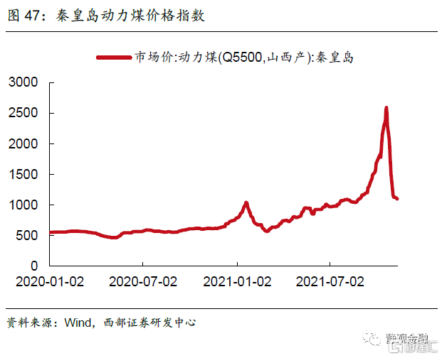 保供稳价政策发力下国内定价大宗商品价格回落,极端天气对能源需求影响明年难以再现。今年以来,国常会连续多次点名大宗商品,提出要保障大宗商品供给,遏制价格不合理上涨。随着保供稳价措施的持续发力,煤炭价格有回落趋势。10月19日,国家发展改革委表示,将充分运用《价格法》规定的一切必要手段,研究对煤炭价格进行干预的具体措施,促进煤炭价格回归合理区间,促进煤炭市场回归理性[5]。国家发改委日前表示,煤炭调度日产量已稳定在1200万吨以上,连续创下历史新高[6]。截至11月22日,秦皇岛动力煤价格已从10月最高点下跌57.8%,煤炭库存也开始企稳回升。在政策积极调整的背景下,国内定价产品供给在中长期不会形成约束,预计明年价格大概率回落正常区间。