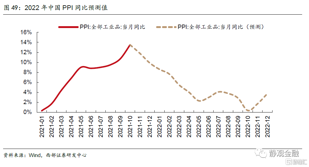 高基数下预计明年PPI增长中枢将下行,全年均值约为4%。预计2021年PPI增长中枢在7.9%左右,基数效应下,2022年PPI大概率回落。整体上看,明年PPI同比呈下行趋势,上半年PPI同比回落,下半年同比低位运行。2021年大宗商品价格的快速上涨,导致PPI同比读数走高,9月(10.7%)、10月(13.5%)连创新高,高基数下预计明年PPI增长中枢将下行,全年均值约为4%。