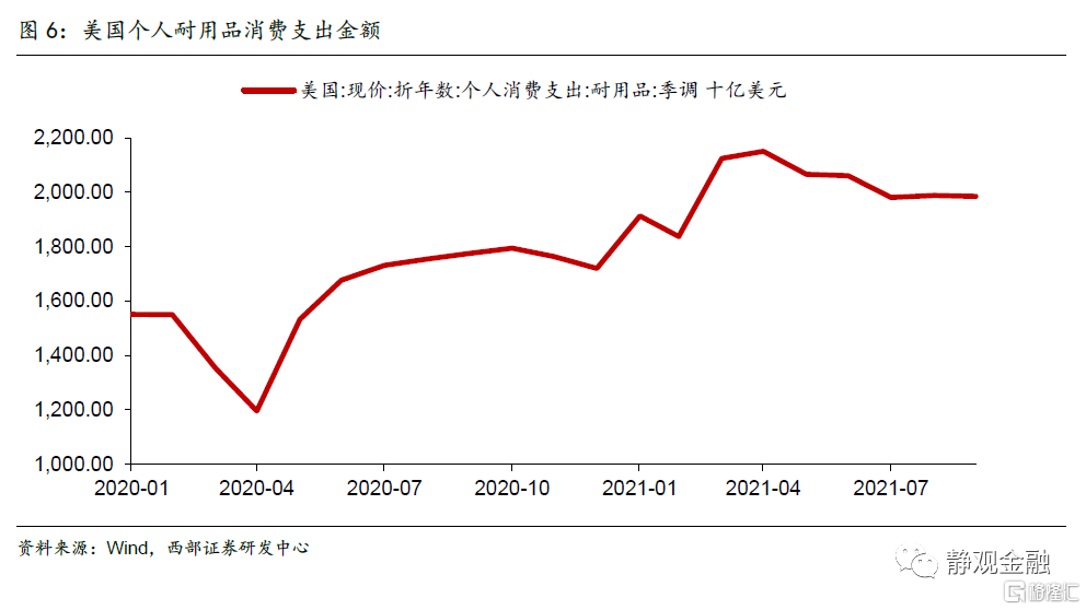 事实上,今年Q3开始上述因素皆已不同程度转弱。首先,当前欧美等国陆续接种疫苗导致防疫物资出口金额放缓,该因素对中国出口影响中性转弱。其次,全球制造业PMI数据自6月起持续下滑表明全球经济复苏斜率最陡峭的阶段已经过去,也意味着其对中国出口增长的拉动渐趋温和。此外,随着美国财政转移支付基本结束,防疫措施解除,导致5月起美国个人消费结构逆转,同时美国地产销售热度降温对地产后周期商品需求的掣肘亦将抑制中国对美耐用品出口。最后,今年以来日韩出口对全球经济复苏的敏感度回升,意味着中国出口的供给替代逻辑已被削弱。
