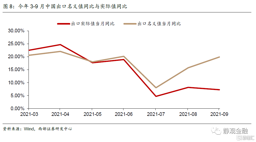 但是为什么近几个月出口同比增速依然强劲?价格因素是重要支撑。截至8月,全球货物进口数量指数由去年12月的125.3上升至129.8,涨幅为3.6%;全球货物进口价格指数则由去年12月的103.0上升至112.7,涨幅为9.5%;中国主要外贸对象国进口总额则从去年12月的9816.2亿美元上升至今年9月的11137.3亿美元,涨幅为13.5%。可以说2021年外需回暖的主要原因系全球货物价格上涨所致,其次才是经济修复。如图8所示,剔除价格因素后,Q3中国出口实际值当月同比中枢已经吿别两位数、降至个位数。
