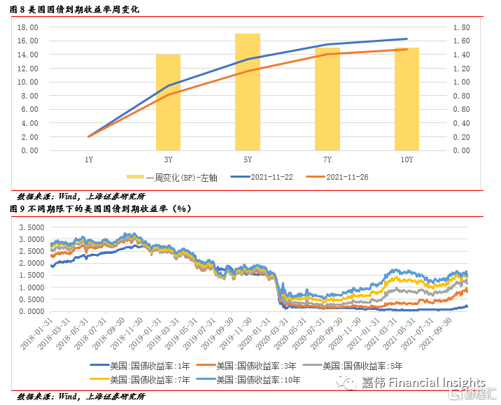美联储公布初联邦公开市场委员会(FOMC)货币政策会议纪要显示,与会美联储官员认为当前美国的高通胀水平反映了可能存在的暂时性因素,但通胀压力得到缓解会比早前预测的时间更久。能源价格上涨,工资增长强劲,房租支出高企,这些都助推了通胀。虽然通胀压力会持续更长时间,多数观点仍然是明年的高物价压力会有所缓解,不确定性也在增强。此外,美联储新一届主席落地,Omicron疫情担忧,美债到期收益率大幅下行。