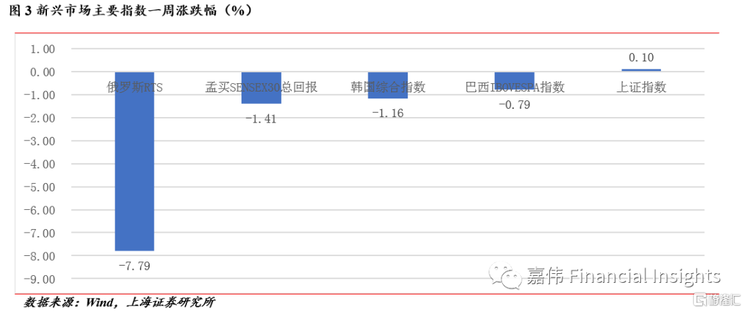 新兴市场行情分化。得益于我国疫情控制良好,我国上证指数上涨0.1%。其他指数均表现下跌,孟买、韩国、巴西市场均表现下跌,幅度在1个点上下。俄罗斯RTS指数下跌幅度最大,为-7.79%
