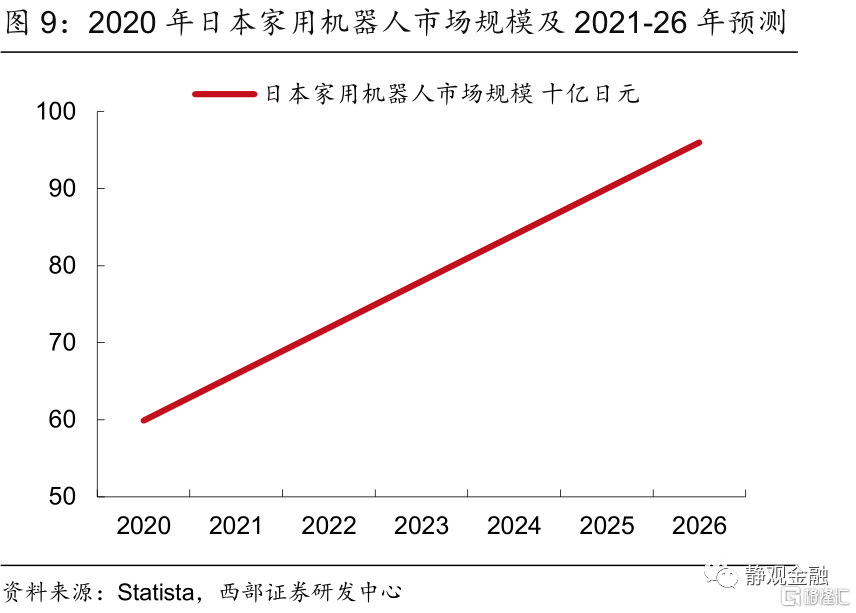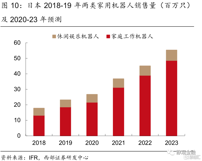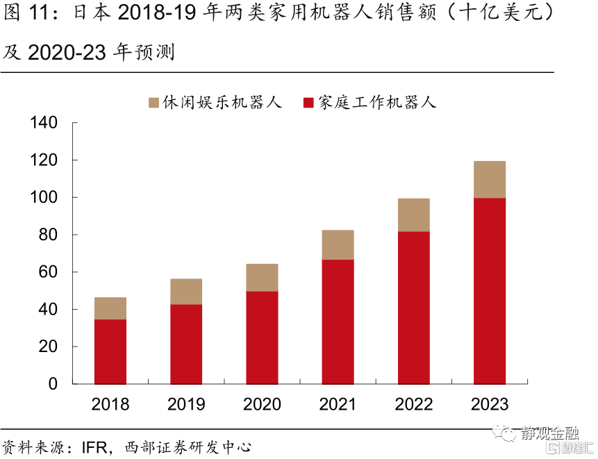 老龄化背景下日本养老机器人产业未来可期。2013年起日本不断出台政策鼓励发展家庭生活支援机器人,意在通过机器人来解决居家养老中的困难。养老机器人可分为护理机器人、康复机器人和陪伴机器人。其中,护理机器人和康复机器人主要解决老年人的生活需求,属于他助型养老服务机器人,主要应用于医疗和护理场景;而陪伴机器人则能够满足老年人的心理情感需求,适合家庭和机构养老。2020年日本投入12.33亿美元用于研发机器人,其中9.97亿美元(81%)用于护理和医疗机器人。2020年日本家用机器人市场规模为599亿美元,根据Statista预测2026年将达到960亿美元,年均复合增速8.2%。此外,若将家用机器人按工作类型分为家庭工作和休闲娱乐两类,前者市场空间更大。2018-2023年家庭工作机器人销售量和销售额年均复合增速分别为29.8%和23.3%,休闲娱乐机器人销售量和销售额年均复合增速分别为7.8%和11.5%。