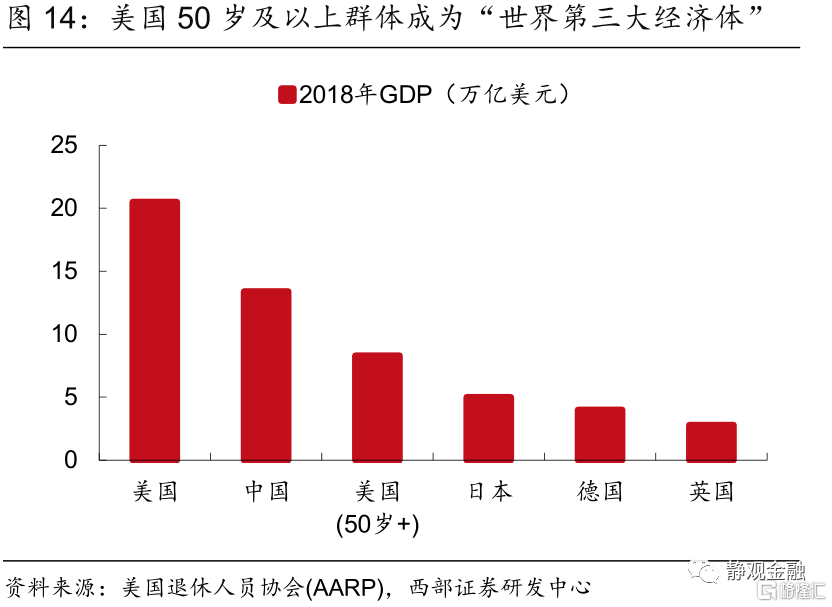 美国老年群体具有两个明显特征。首先,收入来源丰富据美国人口普查局统计,2020年美国65岁以上的老年人中,83.6%的人享有社会保障收入,40.7%的老年人享有退休金,68.1%的人享有财产收益(主要包括股权、房地产等资产带来的收入),23.1%的老年人享有工作收入(包括工资和自雇佣)。值得注意的是,在2000年,65岁以上人口中享有工作收入、享有财产收益的人口占比分别为17.2%和60.6%。2000-2020年间,越来越多的老年人拥有工作薪水和财产收益,丰富的收入来源是该群体消费能力的保障。第二,社交需求很高不同于国内老年人的宅家习惯,美国居民在退休后仍喜欢外出参与各种活动、体验新鲜事物、结交朋友;美国老年群体对社交场所和网站的需求更高。