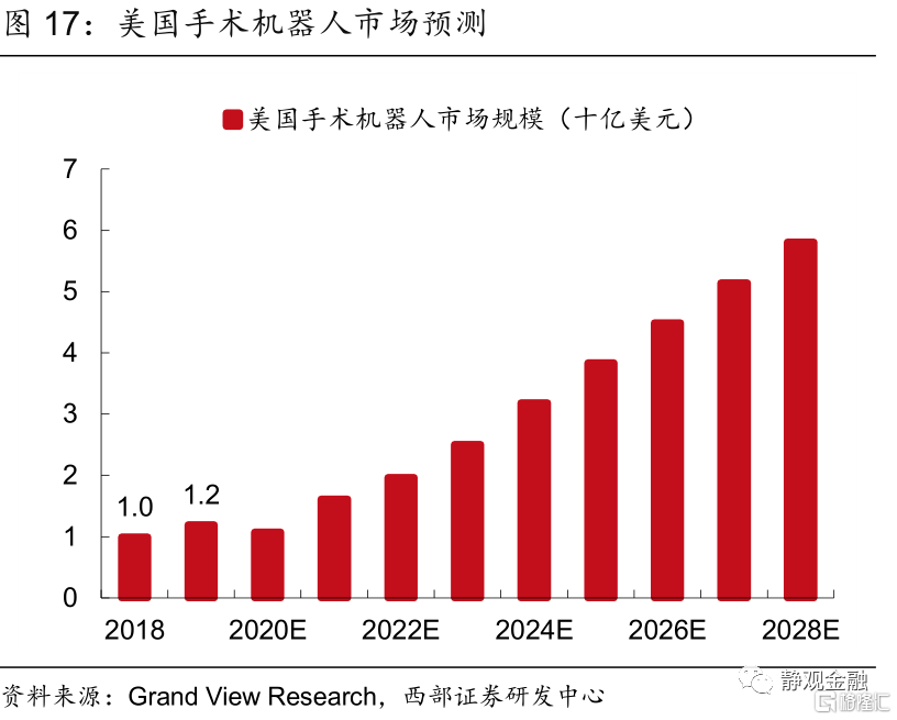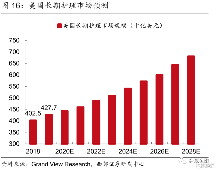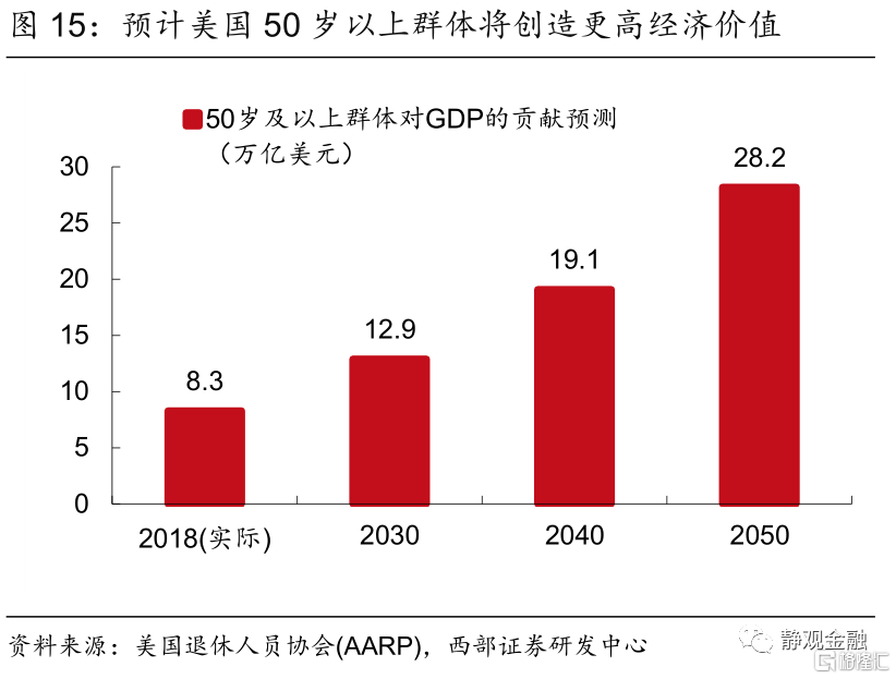 美国养老商品和服务的需求旺盛,行业增速可期,将为美国GDP做出重要贡献。根据美国退休人员协会(AARP)的数据统计,2018年美国50岁以上群体对美国对经济的贡献总计8.3万亿美元,这一数值仅次于当年美国和中国的GDP总值,成为“世界第三大经济体”。AARP预测到2050年50岁以上老龄群体的贡献将增加两倍,达到28万亿美元以上。具体行业方面,根据Grand View Research预测,2019年美国长期护理市场规模约为4277亿美元,预计2021-2028年复合年增长率为5.7%;2019年美国手术机器人市场规模为12亿美元,预计2021-2028年复合年增长率为20.1%。根据Zion Market Research预测,2020年全球糖尿病食品市场的份额为107.5亿美元,预计到2028年将达到151亿美元,2021-2028年的复合年增长率约为4.3%。