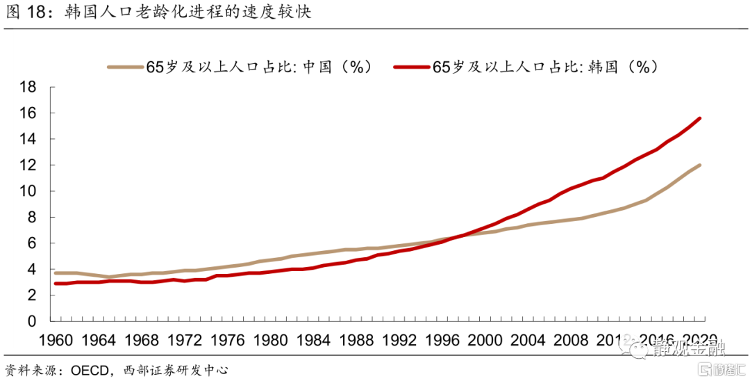 韩国人口老龄化进程较快,积极发展“老龄亲和产业”。韩国65岁以上人口占比在2000年达到7%,进入初步老龄化社会;2018年达到14%以上,正式成为老龄社会,这一过程韩国仅用了18年(日本用了24年,美国用了60余年);2020年韩国首现人口负增长,且65岁以上人口占比达新高15.6%。韩国将养老产业定义为“老龄亲和产业”(senior-friendly industry)并于2006年出台《老龄亲和产业振兴法》,该法将老龄亲和产业的对象界定为 65 岁以上的老人及其照护人员。韩国养老产业主要分为疗养、食品、药品、医疗器械、化粧品、休闲、金融、住宅、日用品 9 大产业。
