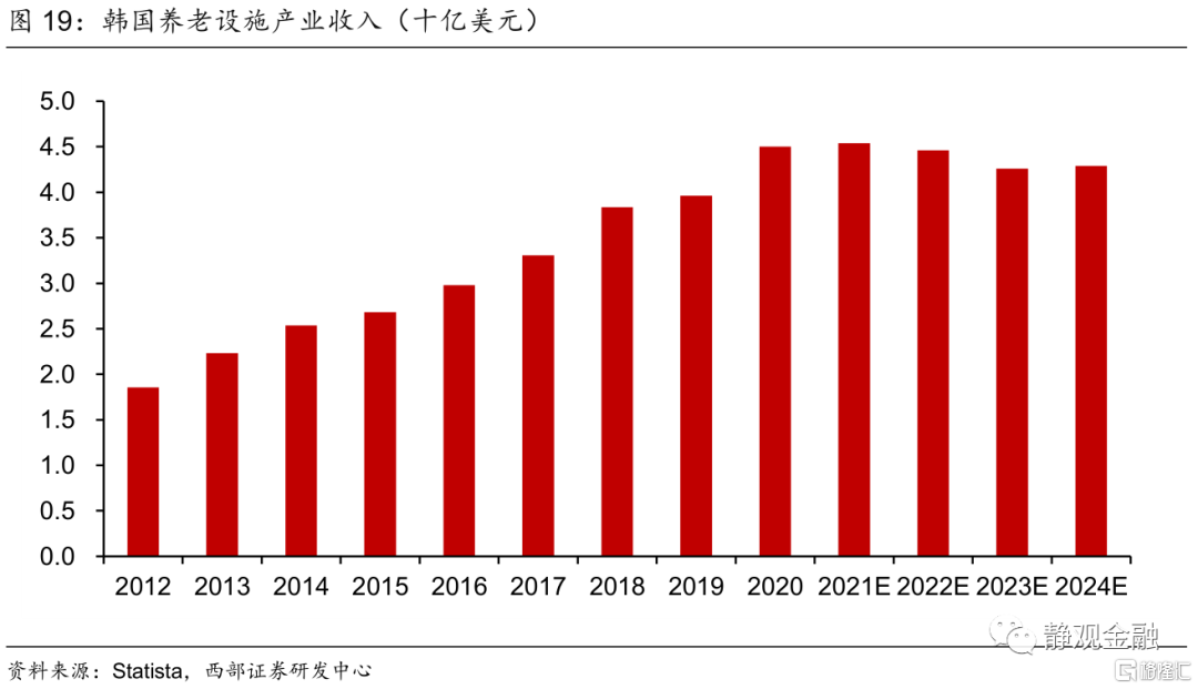 韩国老年医疗、养老服务设施市场规模不断扩大,产业进入成熟期。2017年 3 月韩国66 家企业的 498 个产品入选老龄亲和优秀产品后,养老设施产业加速扩张,2012-2020年行业收入年均增速11.82%,据Statista预测,韩国养老设施产业收入将在2021年达到顶峰45.4亿美元,而后小幅回落,未来几年产业收入将稳定在43亿美元左右。