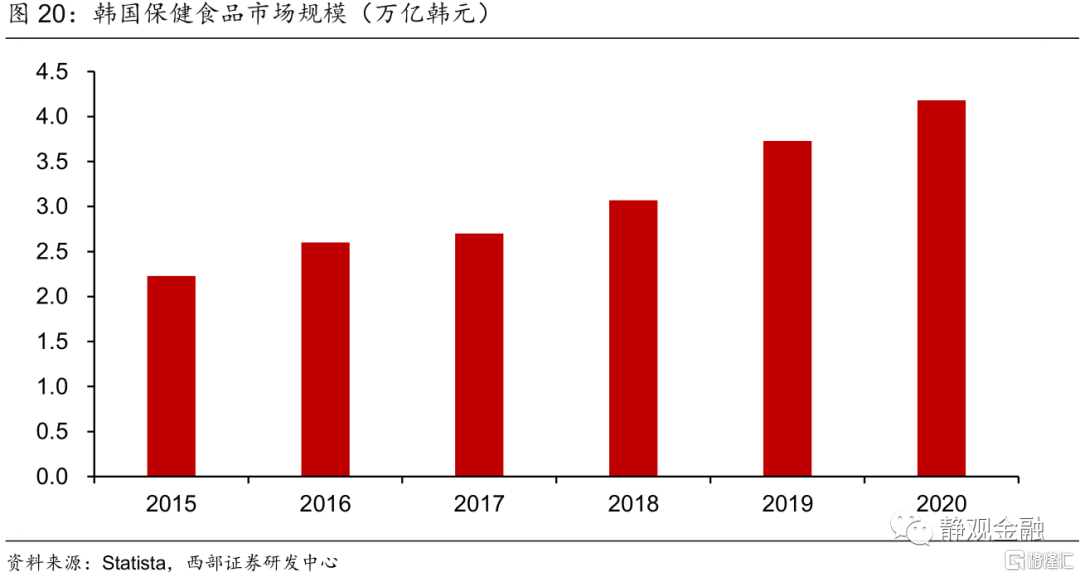 韩国重视老年保健食品市场发展。韩国低盐、低糖、低热量的老年保健食品市场规模从2015年的2.23万亿韩元增长到2020年的4.18万亿韩元,年平均增速13.5%。2021年4月,韩国制定了“对老年人有利的食品”管理规则[2]