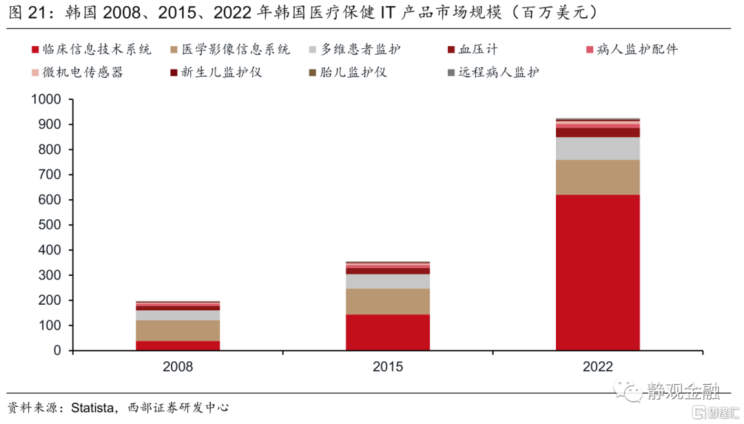 建立数字化医疗生态系统、智能养老快速发展。韩国人工智能技术发展在应对人口老龄化中发挥了重要的作用。据Statista预测,2008-2022年韩国医疗保健IT产品市场规模扩张近4倍,其中临床信息技术系统所占市场份额最大,2022年将达到67%,其次为医学影像信息系统(15%)、多维患者监护(10%)、血压计(4%)等。