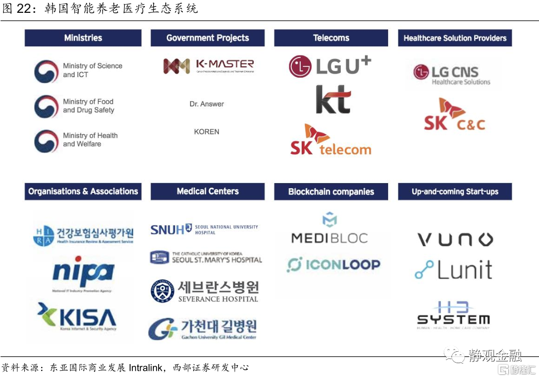 韩国数字化医疗生态系统由政府机构、监管机构、行业协会、医疗中心、大企业、基于区块链的医疗服务提供商等组成,主要参与者包括首尔国立大学医院、三星电子、LG电子、SK电信、以及H3 system、Lunit等初创企业。韩国的通信公司扩大了以信息通信技术(ICT)为基础的老年护理服务。韩国最大的移动通讯运营商SK电讯于2019年推出了以人工智能为基础的老人护理服务,并与当地政府合作为老年人提供AI扬声器“Nugu”。韩国还在积极研究能够陪伴老人的智能机器人,人可以与老年人进行口头交流,提供个性化护理,同时监控老年人的活动。