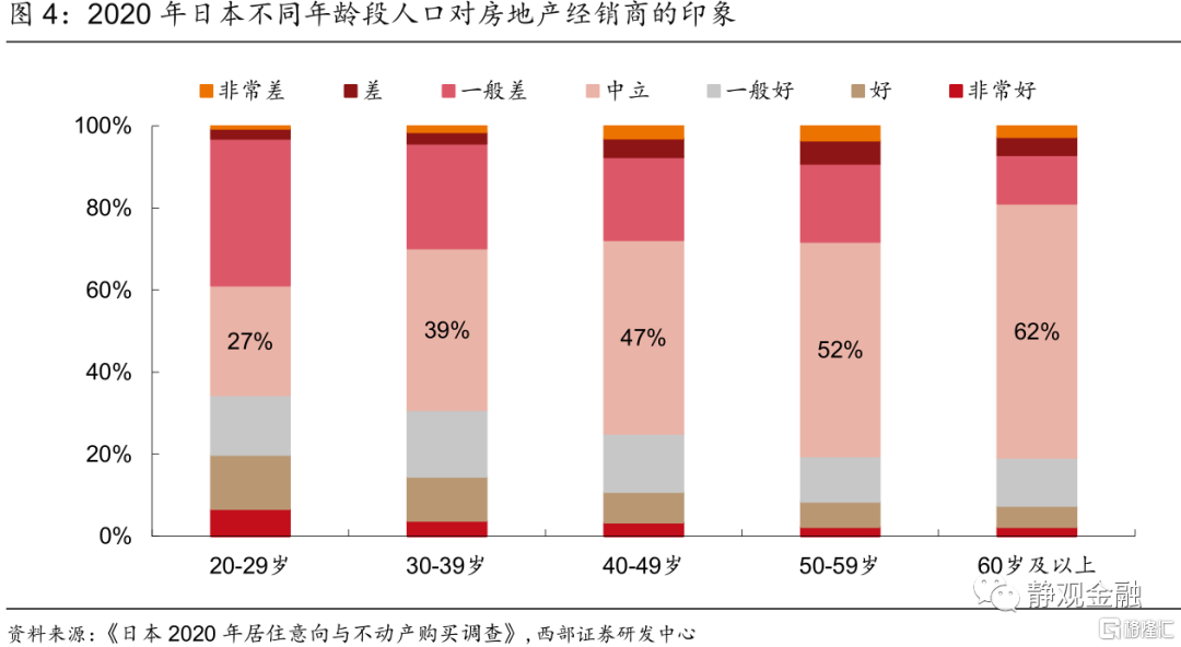 日本的服务型老年人住宅模式大有可取之处。日本养老地产产业发展极其成熟,目前至少有专为老年人设计的12种类型的地产。根据住宅权利形式,这12种养老地产又可以分为四大类[1]:1)投资型住宅;2)租赁住宅;3)居住设施;4)护理保险设施。2011年日本政府通过《老年人住宅法》,将养老地产逐渐由护理设施转向服务型老年人住宅,即提供租赁形式的住宅代替传统养老院,并配套相关需求设施及服务,带有很强的“社区”属性,减少老年人的社会脱离感。根据《国外养老产业投融资模式案例汇编》的描述,2011-2014年是服务型住宅市场经历快速增长期,2011-2014年新建住宅的年投资总额平均为3.59亿日元,登记数由10.9万家上升至14.5万家,随后增速开始放缓。根据《日本2020年居住意向与不动产购买调查》,2020年日本老年人对房地产经销商的印象“中立偏好”的比例为81.1%,是全年龄段最高,表明目前日本老年人对房地产行业接受度较高。此外,2011年以来的日本养老地产发展还有两大特点:第一,护理和医疗服务突破了护理医疗设施的局限,使其可以“走到”老年人家中;第二,政府通过补助和税收优惠政策吸引民间资本力量推动服务型老年人住宅发展。