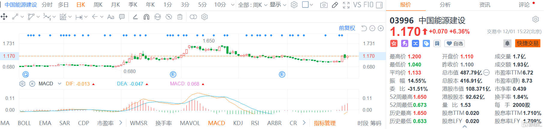 格隆汇12月1日丨中国能源建设(3996.HK)股价高位震荡,现报1.17港元,涨幅6.36%,总市值487.8亿港元。公司上月26日公告称,为抢抓氢能行业发展机遇拟设立全资子公司中能建氢能源发展有限公司。国信证券认为,氢能子公司的建立提前卡位氢能全产业链布局以全面践行公司“30·60”战略目标。子公司落户大兴有望提升产业链协同合作效率,实现公司 “风光储充换氢”供能体系的完善,提供业绩增长新动能。预计公司2021-2023年归母净利润为72.83/81.61/95.93亿元,增速9.9%/12.1%/17.5%,维持“买入” 评级。