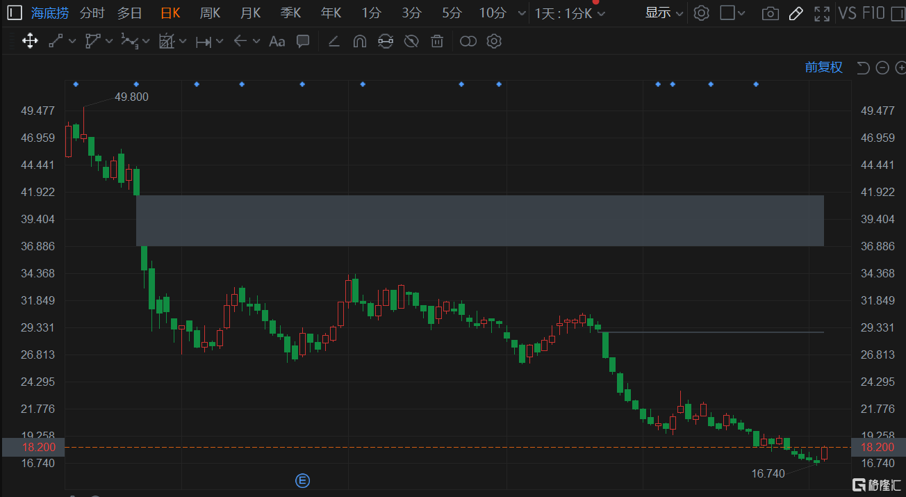 格隆汇12月3日丨昨日创调整新低价的海底捞(6862.HK)反弹逾7%止步5连跌,现报18.18港元,总市值1014亿港元。