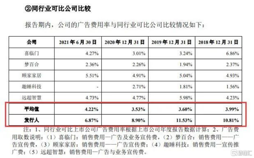 2018-2020年以及今年上半年,慕思支出的广告费用分别为3.45亿元、4.45亿元、3.96亿元以及1.93亿元,分别占营业收入的比例为10.81%、11.53%、8.90%以及6.87%,远超行业平均水平,其中冠名赞助和公共交通广告是大头。