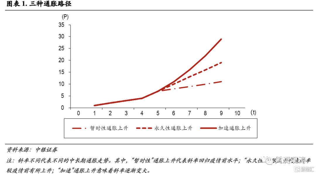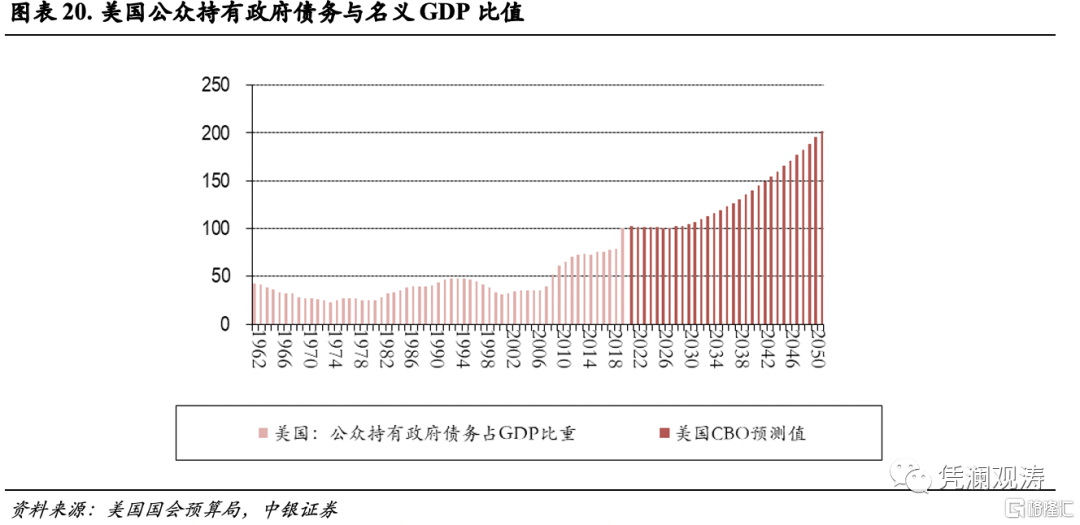 虽然有观点认为财政刺激是一次性的冲击,在居民储蓄消耗至疫情前水平后通胀将回归常态,但是美国国会预算局的财政预期路径并不认同,其预测显示债务上升将是未来的常态(见图表20)。尤其是,美国总统拜登仍在大力推动1.2万亿基建法案和1.75万亿支出法案。其中,1.2万亿美元基建项目已于11月6日获得国会通过。根据财政通胀公式[7],当政府主要账户的未来预期值不断下降时,要么靠通胀上升来匹配,要么靠日本化的“泡沫项”来匹配。对于美国来说,中期的通胀作用将会超过“泡沫”作用。