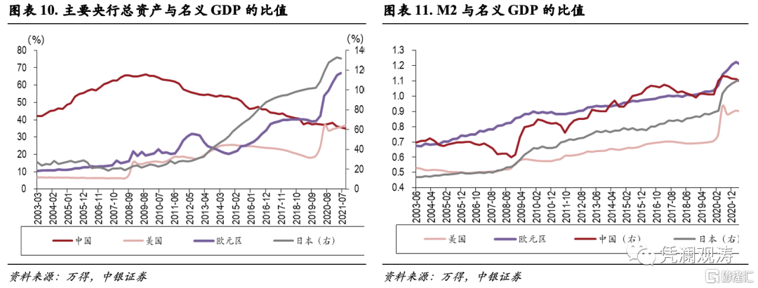 发达国家货币放水,一波未平一波又起。从主要央行资产负债表规模与名义GDP看,美联储、欧央行和日本银行资产负债表在2020年扩张的效率远超金融危机时期,分别上升15.0、22.4和28.1个百分点(见图表10)。2021年以来,随着经济复苏,日本银行和欧央行的扩张速度有所收敛,美联储在三季度GDP增速大幅放缓的推动下再创新高。如果2009年是第一次见识到“非常规”工具量化宽松,这次便是感受到何谓美联储眼中的“资产负债表规模不存在理论上的上限”。低利率环境下,非常规工具变成常规工具,负利率被反复讨论。