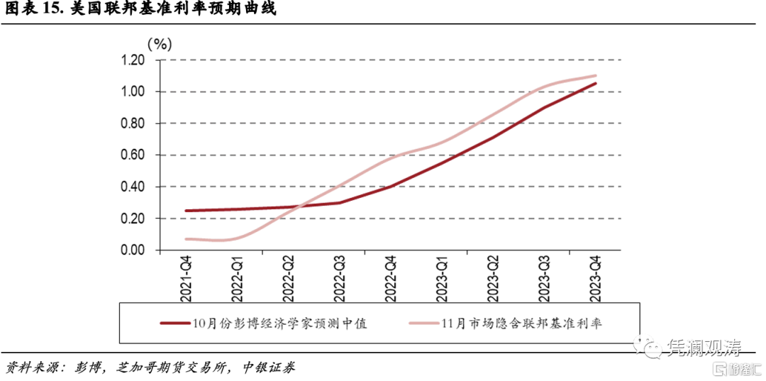 虽然2021年以来美股估值回落,但是如此高的贡献(贡献了54%的美股上涨)是否可以持续,仍值得怀疑。2022年经济回落后收入增速也可能跟着回落,叠加2019年美股上涨也是依靠提估值(2019年估值上升贡献接近100%),美股透支未来收益的程度不可谓不高(见图表14)。考虑到市场已经开始定价加息预期,高估值撞上流动性拐点并不是一件好事(见图表15)。另一个货币蓄水池房地产也有忧虑。超低的长端利率推升美国房地产价格一路暴涨,涨幅已经创下次贷危机以来的新高。这也招致多位前美联储高官呼吁立刻停止购买MBS。因而,实体也需要“被动”吸收多余的货币。