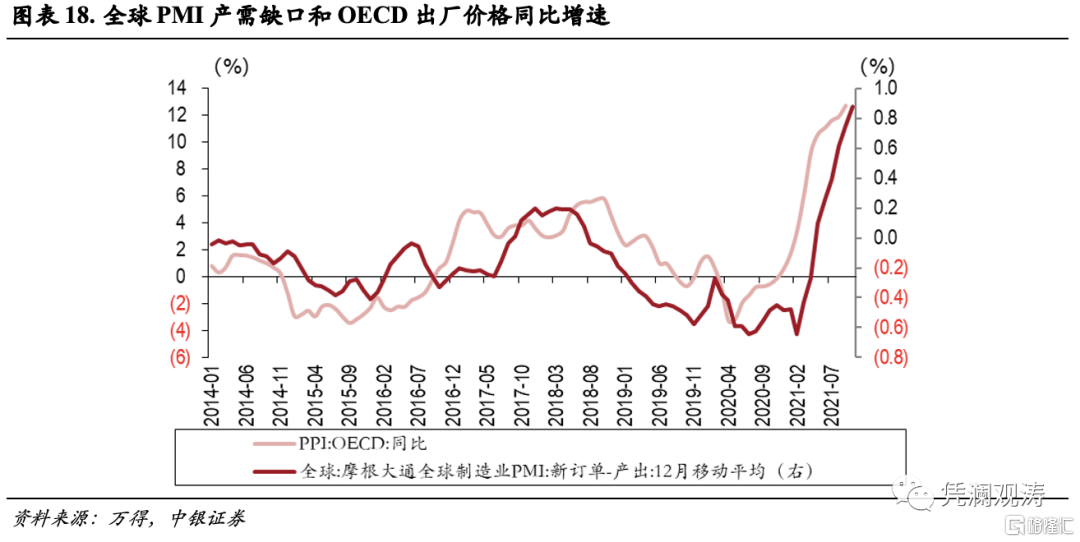 2021年以来,供给收缩的通胀压力仍未获得显著改善。尤其是,各行各业产能和就业恢复效率不尽相同,叠加供应链的牵连作用和大规模财政刺激的强化作用,通胀压力迅速上升,多个国家出现供不应求的状况。以摩根大通全球制造业PMI新订单与产出的差值作为供需缺口指标,其12个月移动均值与全球PPI同比增速高度同步,10月产需正缺口达到2.1个百分点,创下数据以来新高,物价压力不言而喻(见图表18)。与1970年代相似的是,供给端冲击引发“滞涨”已经初现征兆,不同的是,当前供给不足并非生产率或是生产意愿低下,而是疫情及其后遗症彻底搅乱了全球化的供应链。
