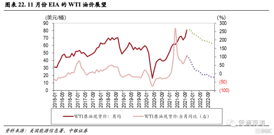 在供给端,在原材料价格大幅上涨、供应链断裂和物流运力短缺的影响下,主要经济体均面临生产者物价飙升。原材料价格方面,由于近期全球能源短缺问题越演越烈,叠加原油是大宗商品之母,原油及能源价格最受关注。2021年以来(至10月份),WTI原油现货月均价格累计上涨34美元/桶,同比上涨105%。快速上涨的油价也推动市场不断上调油价预期,甚至有观点认为2022年油价有望突破100美元/桶。11月份,美国能源信息署(EIA)预计,寒冬来临和服务业复苏将显著增加能源需求,四季度油价有望维持在80美元/桶附近;随着OPEC+增产和经济回落,2022年油价将逐季回落,年度均价与2021年持平(见图表22)。但是,另一家国际能源机构却发出不同的观点。11月份,国际能源署(IEA)公布最新市场报告,大幅上调2022年原油预期价格,预计2022年原油平均价格较2021年进一步上涨11%。2022年,OPEC+是否愿意进一步增产、美国页岩油企业会否因油价上涨而打破政府环保政策束缚和国际旅游能否摆脱疫情影响等多种因素均存在不确定性。