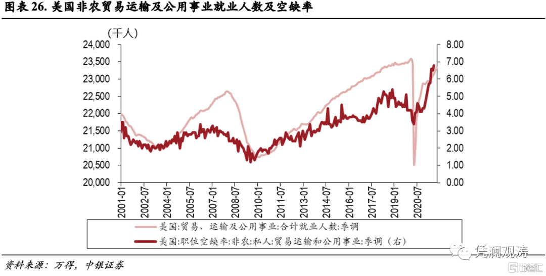运力的缺失也导致了美国制造商和零售商的库存出现显著差异,一边是制造商在努力补库存,库存同比增速已经超过疫情前水平,另一边是零售商库销比处于历史低位,各地超市的货架空空如也(见图表25)。因而,美国对贸易和运输劳动力的需求非常高,但是却不见职位空缺率或者空缺数有所下降(见图表26)。根据三季度杜克大学全美CFO调查显示,72%的企业遭遇用工紧张,其中82%的企业选择加薪解决劳动短缺。