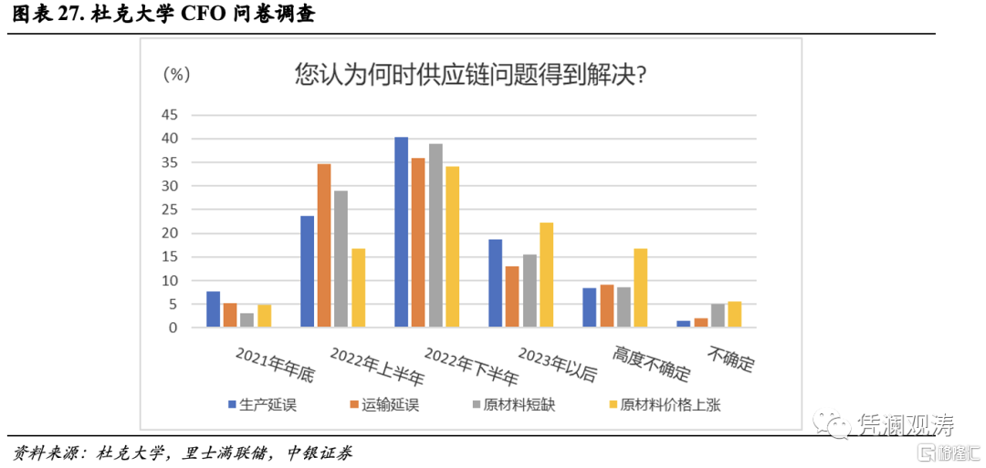 成本推动CPI能力中外有别。影响传导效率的因素主要有三点,一是成本上涨是否暂时的,即持续多久;二是企业是否有足够能力吸收成本上涨的压力,即坚持多久;三是工资成本上升后能否快速转化成消费回流企业,即消费需求强弱。对于中国来说,部分企业对于第一点和第二点在短期内解决的信心已经开始动摇。尽管原材料成本已经逐渐导致部分企业不得不转嫁至消费者,但是中国在第三点的传导途径上仍有不小的阻碍,需求偏弱和就业市场仍有压力的格局尚未彻底迎来转变,2022年CPI大幅上行的风险较小。对于美国来说,这方面的阻碍相对较少。根据近两期的杜克大学CFO问卷调查显示,二季度,超过七成的小企业将选择涨价来应对成本上升,大企业的比例则接近九成;三季度,仅不到10%的企业认为供应链可以在年底前修复,绝大数认为可能会延续至2022年下半年(见图表27)。