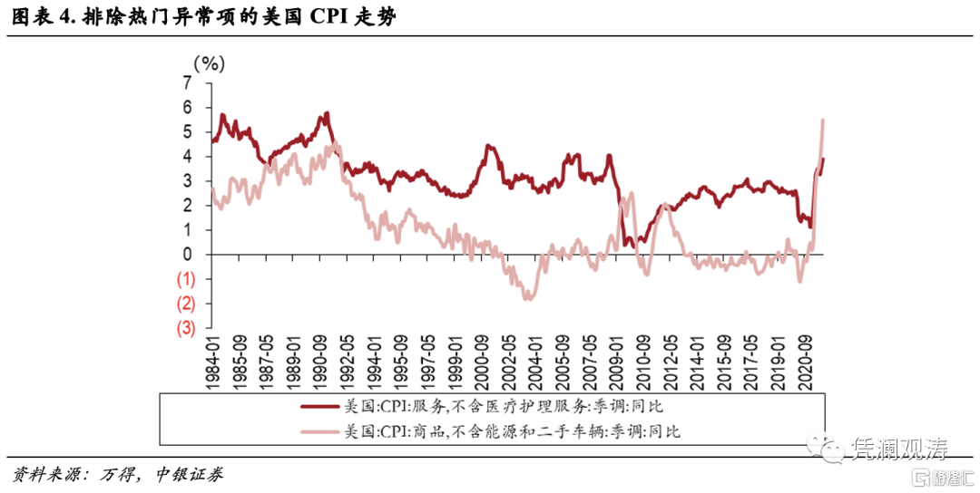 其他主要经济体CPI均受到能源和原材料金属价格的“异常”拉动,仍有机会可以观望“异常项”价格是否回落或者会否扩散至其他领域。而从CPI分结构看,美国的高通胀可能无法单纯用“异常项”驱动来解释。除了医疗保健[1]以外,美国的CPI分项通胀增速均高于过去5年均值,多个分项已经是趋势值的3倍以上,包括主要经济体共同“异常”的能源及交通运输(见图表3)。“暂时性”通胀的最大依赖是底层通胀趋势没有改变,异常分项最终会向长期趋势靠拢[2]。有趣的是,美国经济重启后,服务(不含医疗护理服务)CPI不仅没有如期向趋势项回归,还大幅超过疫情前水平;而不含能源和二手车(两大热门通胀项)的商品CPI仍在一路狂奔,创下近40年的新高,令人好奇何时是回归拐点(见图表4)。均值回归的逻辑缺陷在于忽略了持续存在的高通胀风险。