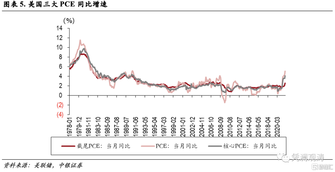 不管是学术界还是业界,对“暂时性”通胀的怀疑越来越浓厚。从美国CPI拆解来看,大部分分项均高于过去5年均值,表明通胀快速上升已经不仅仅限于能源领域和原材料价格。虽然主要国际机构和央行仍在使用“异常项”均值回归逻辑来预判通胀走势,但是也开始承认通胀风险偏向上行。此外,超低利率显著提振了耐用品消费能力,持续过度宽松有产生信贷泡沫的风险。