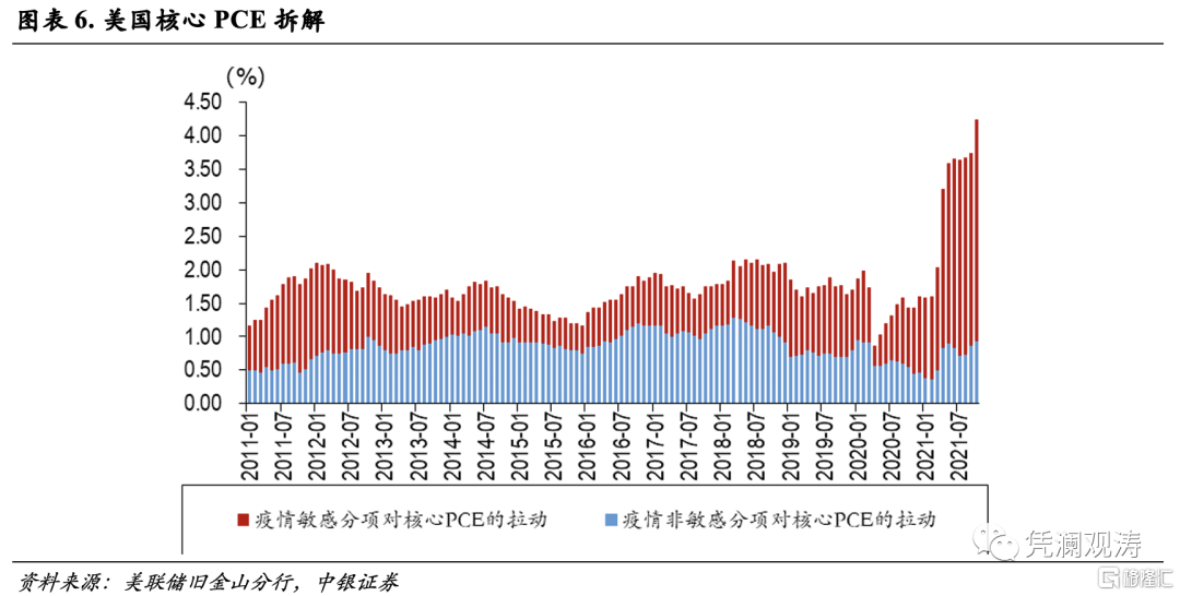 有鉴于此,美联储旧金山分行推出了疫情敏感和非敏感的PCE增速。其归类原理是将核心PCE内的124个小分项进行归类重构,如果价格和消费量在2020年2月至4月出现明显异常变动,就归为疫情敏感PCE[3]。从结果上看,2020年疫情期间价格大幅下跌的疫情敏感分项在2021年迎来爆发式上升,10月份同比增速达到5.3%,拉动核心PCE增长3.3个百分点,而疫情不敏感的PCE分项也在三季度迎来反弹(见图表6)。其中,疫情敏感PCE中有3个分项值得关注:一是在PCE中占比20%的医保服务费用,政府为新冠疫情承担的医保转移支付将在2021年年底前结束,可能会成为2022年PCE增速的拖累项;二是经济重启后二手车价格的大涨,周期消费品价格在经济复苏期间上涨是常理,但是芯片短缺进一步推动价格飞升[4];三是能源价格,2020年油价一度出现过负值,2021年油价一路上涨至80美元上方,基数作用就足以推动2021年PCE大幅上升。2022年能源价格涨幅放缓是大部分央行急于看到的。