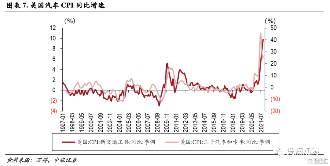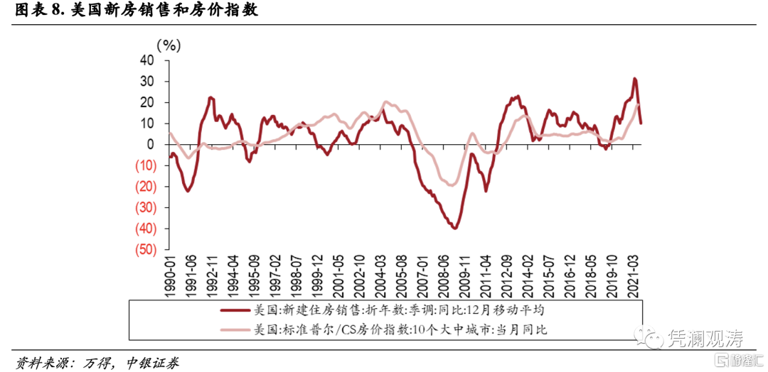 美国周期消费动能放缓,房地产价格却仍未见拐点。周期消费品对经济周期具有重要的指示意义。其中最重要的两项是房地产和汽车。两者均是利率敏感型,对信贷扩张有较大的影响。由于芯片紧缺,汽车销售数量并未出现爆发式增长。但是低利率明显推动消费者购买意愿上升,加上原材料成本的推动,二手车和新车价格相继上涨(见图表7)。房地产的周期性更为明显。随着换房需求见顶回落,新屋销售增速已经有所放缓,但是在超低利率的支撑下,房价的拐点却迟迟未现(见图表8)。