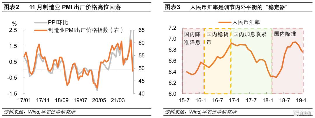 2、货币宽松有无掣肘?一是,11月以来黑色商品与原油产业链价格调整,PPI通胀高点已现,货币宽松的空间逐渐打开。二是,通过释放人民币汇率调节内外平衡的潜力,我国的货币政策具备“以我为主”的调节空间。