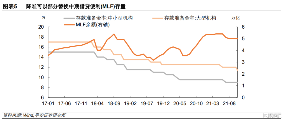 一是,降准大概率会置换部分存量的MLF,资金净投放数量可控。新冠疫情以来,降准在量的层面上中性意味越来越强,并无“大水漫灌”之嫌。2020年4-5月累计降准1个百分点、2021年7月降准0.5个百分点,均伴随着MLF存量下降。当前看,12月15日即将到期的MLF中期借贷便利高达9500亿元,即便央行推出全面降准政策,大概率也会同时替换部分MLF,降准的宽松意义主要体现在替换高成本MLF以降低商业银行负债成本上,资金净投放数量可控。