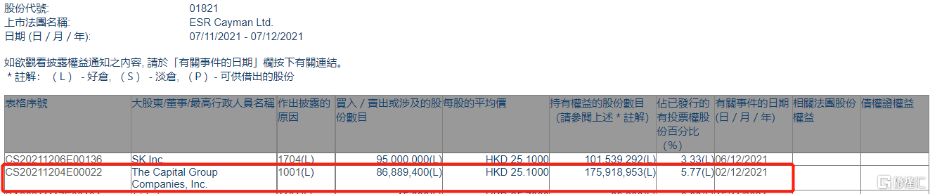 格隆汇APP获悉,根据联交所最新权益披露资料显示,2021年12月2日,ESR(01821.HK)获The Capital Group Companies, Inc.在场内以每股均价25.10港元增持8688.94万股,涉资约21.81亿港元。