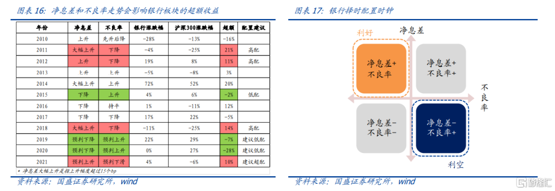 我们构建了一个银行的配置时钟模型。当前预判银行接下来会处于净息差上升、不良率下降的象限,属于双重利好,模型建议超配。