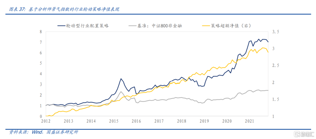 模型历史回测结果如下图所示,基准是中证800非金融,采用个股流通市值加权。行业配置策略多头年化21.7%,超额年化11.3%,信息比率1.55,超额最大回撤4.40%,换手单边年化3.3倍。