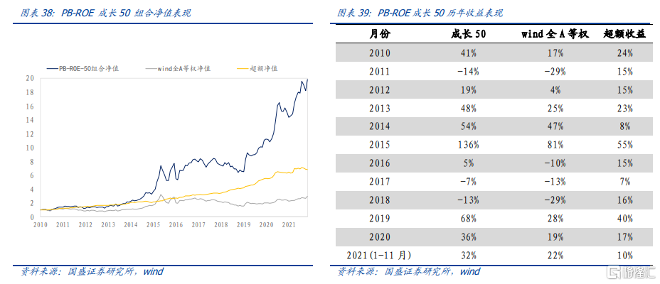 “PB-ROE成长50组合”选股池是wind全A,整体偏小盘股,基准是wind全A等权。2010年至今年化收益率28.7%,基准年化收益率9.6%。2021/01-2021/11组合收益率32%,基准收益率22%。