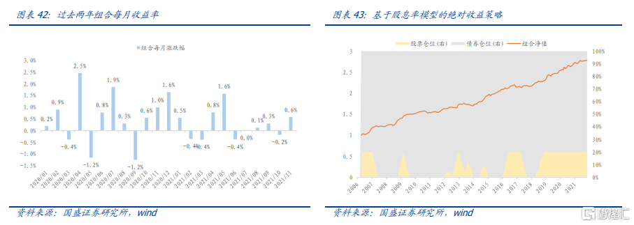 我们基于稳定行业股息率模型构建股债混合策略。当前模型建议股票20%的仓位,其余80%配置中债-总财富(总值)指数,股票仓位已经达到最高。06年至今复合年化收益率6.8%,最大回撤3.7%,2021年1-11月收益率2.66%。
