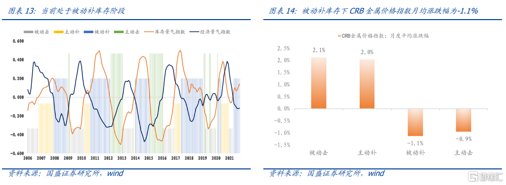 目前宏观状态处于经济下,库存上的状态,库存周期进入被动补库存的阶段,意味着当前处于这一轮库存周期的尾声。在历史上,被动补库存下CRB金属价格指数月均涨跌幅为-1.1%,因此建议规避。