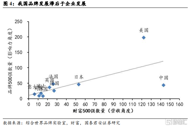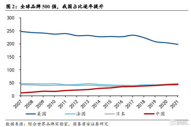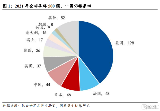 我国品牌影响力持续提升,但仍有较大进步空间,预计2023年将跻身全球第二。12月8日世界品牌实验室编制的《世界品牌500强》发布,该榜单从市场占有率、品牌忠诚度等多个维度进行评估,是对品牌影响力角度对企业进行的排名。从历史数据来看,一方面纵向来看,我国上榜企业数量逐年增加,近十年来每年增加2.3个,到2021年已经达到44个,另一方面横向来看,我国在全球范围内目前仅排第四,位于美国(198个)、法国(48个)、日本(46个)之后,与法国、日本差距不大,按过去10年增长情况来看,2023年就能够跻身全球第二,但与美国仍有较大差距。