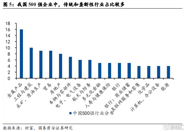 2)其二是相比新兴产业,我国上榜企业大量集中在传统行业,比如金属产品、房地产、建筑、银行等。