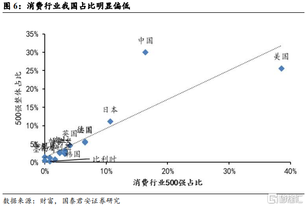 3) 其三是消费领域我国企业占比不高,美国接近40%上榜企业为消费相关领域,我国仅14%,部分反映出消费对经济增长的驱动仍然不强。