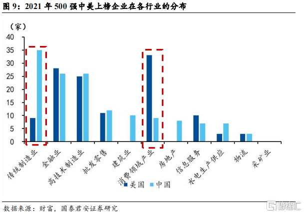 3)其三是消费领域我国企业占比不高,美国接近40%上榜企业为消费相关领域,我国仅14%,部分反映出消费对经济增长的驱动仍然不强。