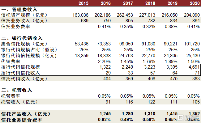 信托业务综合费率约0.66%,对应2020年收入规模约1352亿元。根据中国信托业协会披露数据,2020年信托业务收入约864亿元,信托产品平均管理费率约0.41%。代销收入方面,我们以招行信托产品代销费率测算代销业务规模,代销信托费率约为1.5%,对应2020年集合信托销售规模,测算代销收入约383亿元。综合测算显示,2020年信托产品收入约1352亿元,综合费率为0.66%。